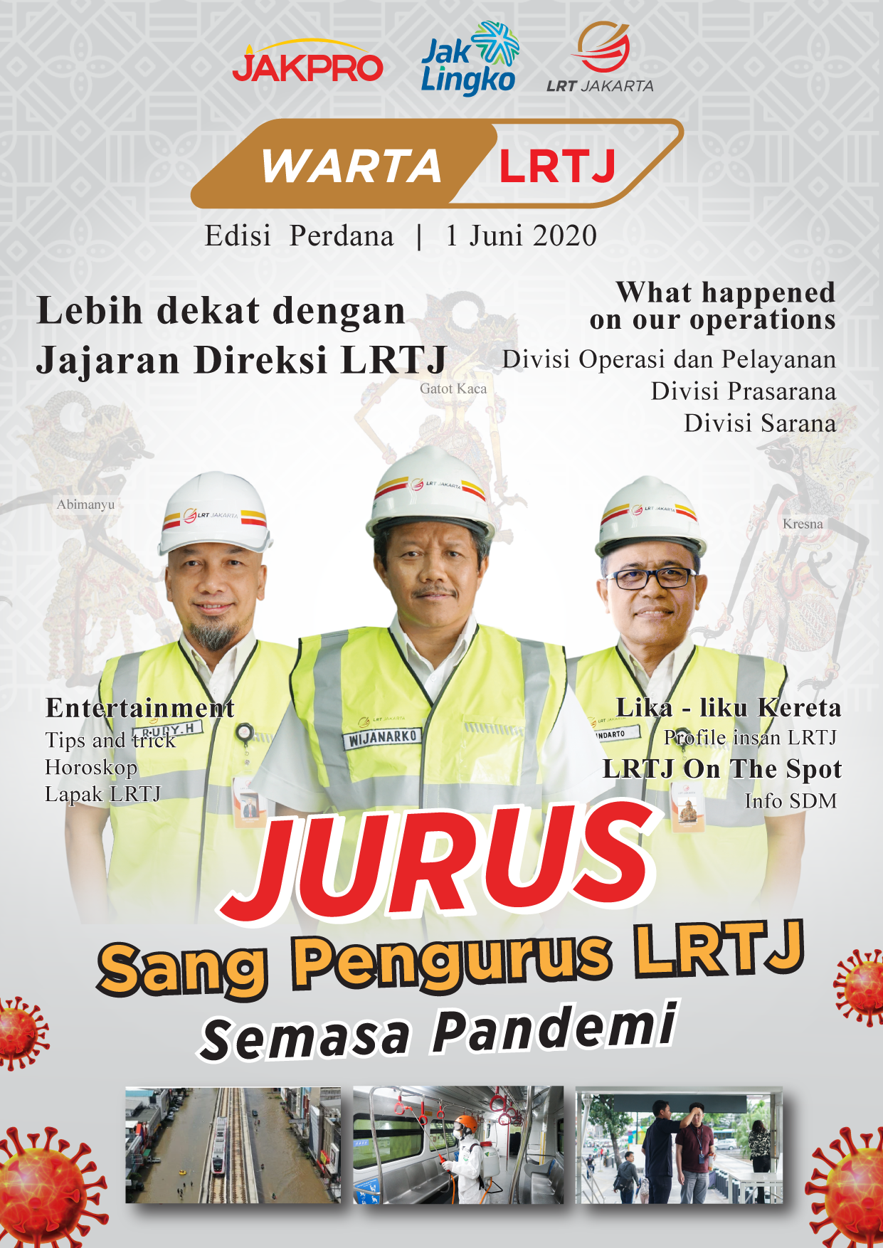 Pada edisi perdana kali ini, Warta LRTJ akan membahas Jurus Sang Pengurus LRTJ selama Masa Pandemi COVID-19, profil Jajaran Direksi LRT Jakarta, berita operasional LRT Jakarta, Lika Liku Kereta, LRTJ On The Spot, Entertainment , Challenge dengan hadiah me