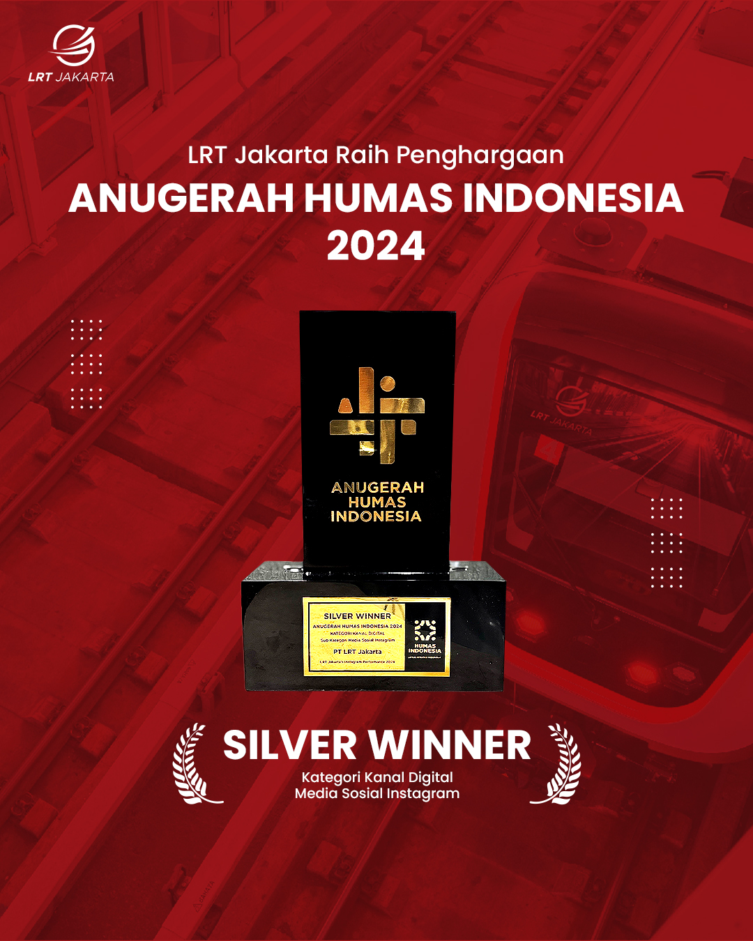 11 Oktober 2024 - LRT Jakarta berhasil meraih penghargaan Silver Winner pada Kategori Kanal Digital - Media Sosial Instagram pada ajang bergengsi The 6th Anugerah HUMAS Indonesia (AHI) 2024 yang diselenggarakan oleh Humas Indonesia di Yogyakarta pada Jum